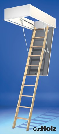 Bewährte 3-teilige Bodentreppe aus Holz. 9 cm tiefe Stufen. Massivholzwangen und Hartholzstufen in stabiler Schwalbenschwanzverbindung.