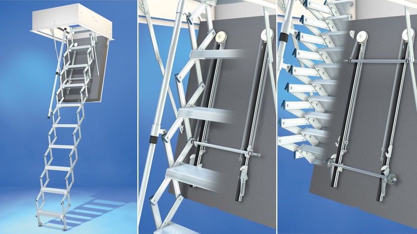 Durch das geringe Gewicht des Strangpreßaluminiums ist die Bedienung der Ziehharmonikatreppe einfach. Die optionale Komfortbedienung (Schienen-Feder-Fixier-System)* macht das Einschieben und Ausziehen des Scherentreppenteils noch leichter. Zusätzliche Fixierhaken erhöhen zudem die Stabilität nochmals deutlich. Bei Raumhöhen von 3,20 bis 4,10 Meter ist diese Ausstattung deshalb immer dabei.