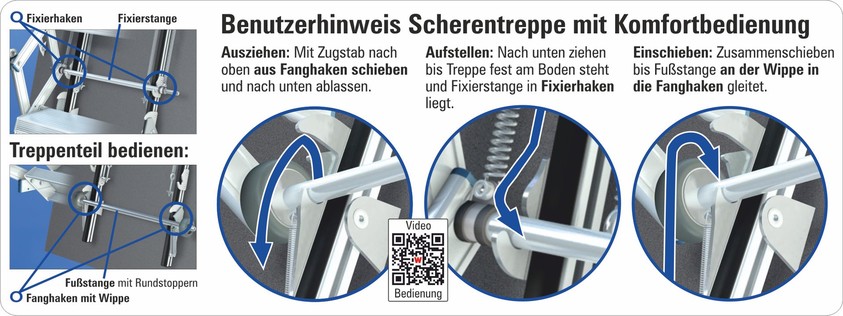 - Achten Sie beim Ein- und Ausklappen (bzw. Auf- und Zusammenfalten) des Treppenteils auf die Hände, um Sie nicht zwischen den Wangen einzuklemmen. Beim Ausziehen und Einschieben das Liliput Scherentreppenteil leicht anheben um Beschädigungen zu vermeiden. Bei Liliput mit Komfortbedienung Benutzerhinweis zu Fang- und Fixierhaken beachten (siehe auch Abbildung und Video unten).