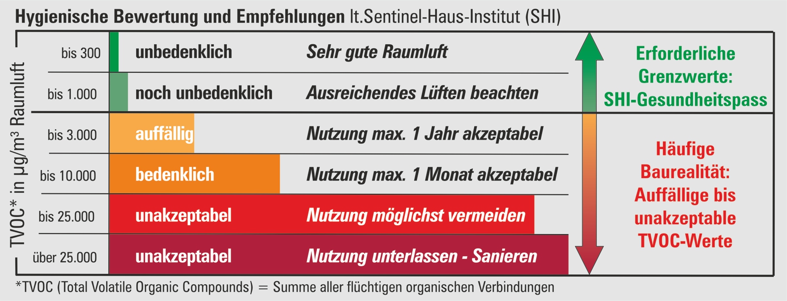 Das renomierte Sentinel Haus Institut hat die internationalen Richtlinien und die Empfehlungen des Umweltbundesamtes im SHI-Gesundheitspass zusammengefasst (Grafik zum Vergrößern klicken). Dieser dokumentiert und zertifiziert rechtssicher die gesundheitliche Qualität von Gebäuden.