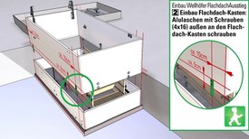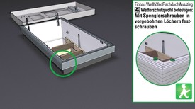 Vor dem Einbau der Bodentreppe erst Flachdach-Kasten und -Deckel auf das Dach bringen. Flachdach-Kasten mit Bodentreppen-Futterkasten verbinden. Ausstiegsrichtung beachten!