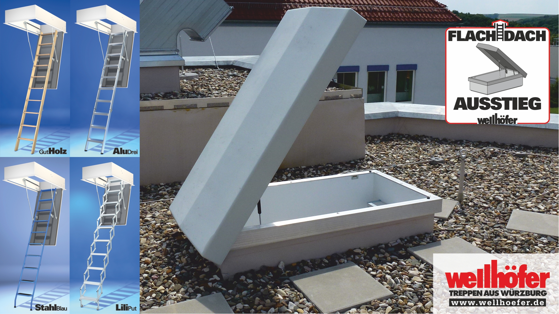 Der FlachdachAusstieg kann mit allen Wellhöfer Bodentreppen kombiniert werden: