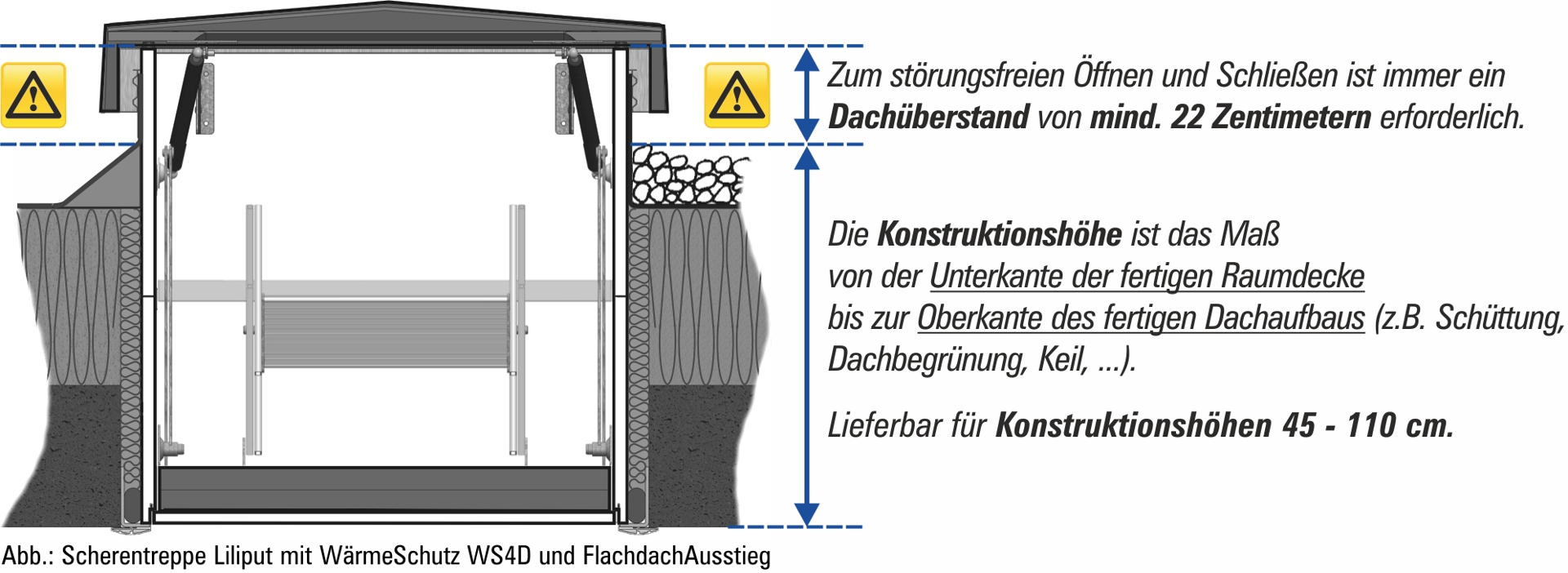 Die Gesamthöhe ergibt sich aus dem Dachüberstand (Vorgabe immer 22 cm) und der Konstruktionshöhe (Unterkante fertige Raumdecke bis Oberkante fertiger Dachaufbau: 45 - 110 cm).