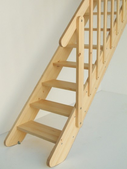 Für Fertighöhen 250 – 285 cm durch Neigung der Wangen. Verschraubte Stufen. Stufenform: gerade oder gewinkelt. Seitlich angeschraubtes Geländer. Holzarten Kiefer, Buche; Oberfläche lackiert.