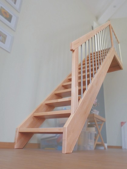 Auch bei wenig Platz kann die Treppe ein Blickfang sein. Bei der Zusammenstellung des massiven Leimholz wird auf korrekten Faserverlauf geachtet. Ihre Auswahl für die Holzart: