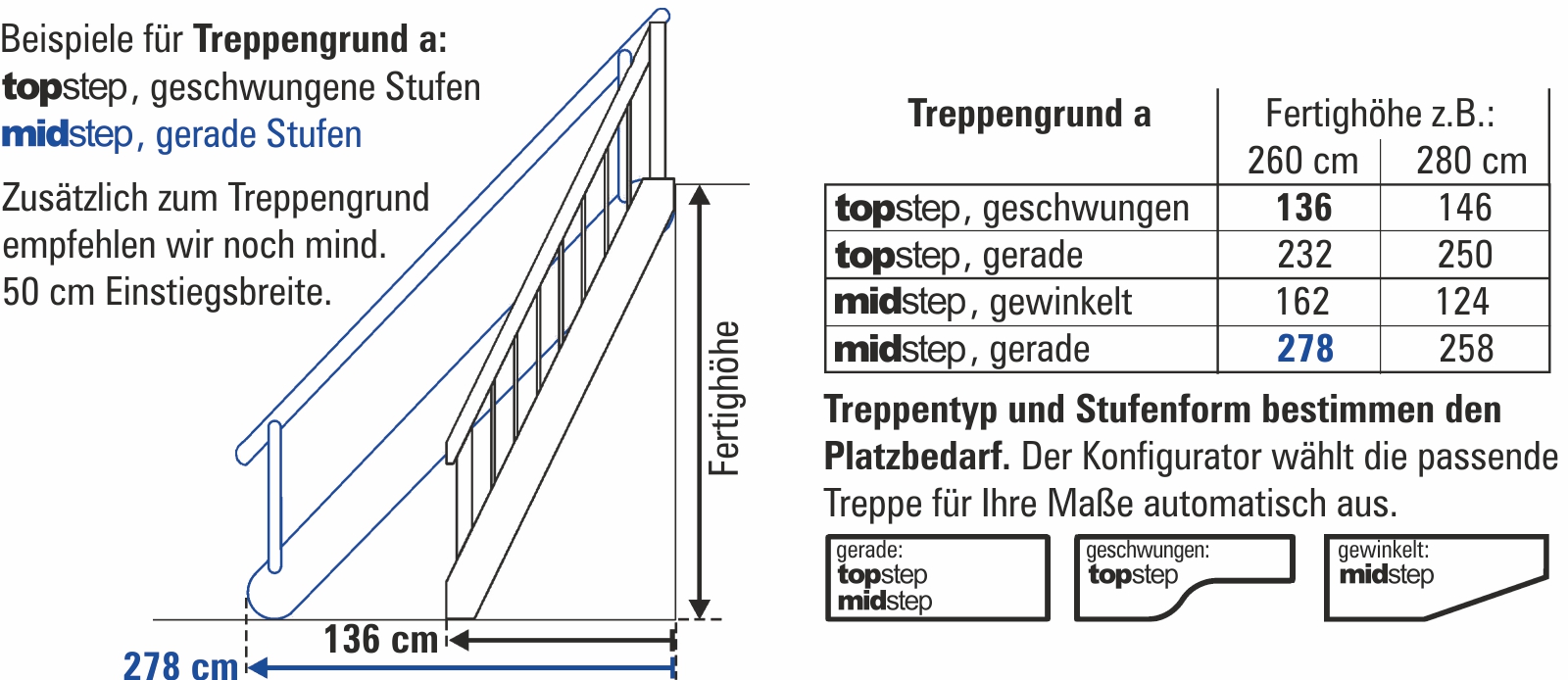 Raumspartreppen sind besonders platzsparend konstruiert. Ist es richtig eng, sind statt geraden Stufen auch Stufen in geschwungener (topstep) oder gewinkelter (midstep) Form möglich, um noch weniger Platz (Treppengrund) zu benötigen. Mehr zu Raumspartreppen-Maßen finden Sie hier.
