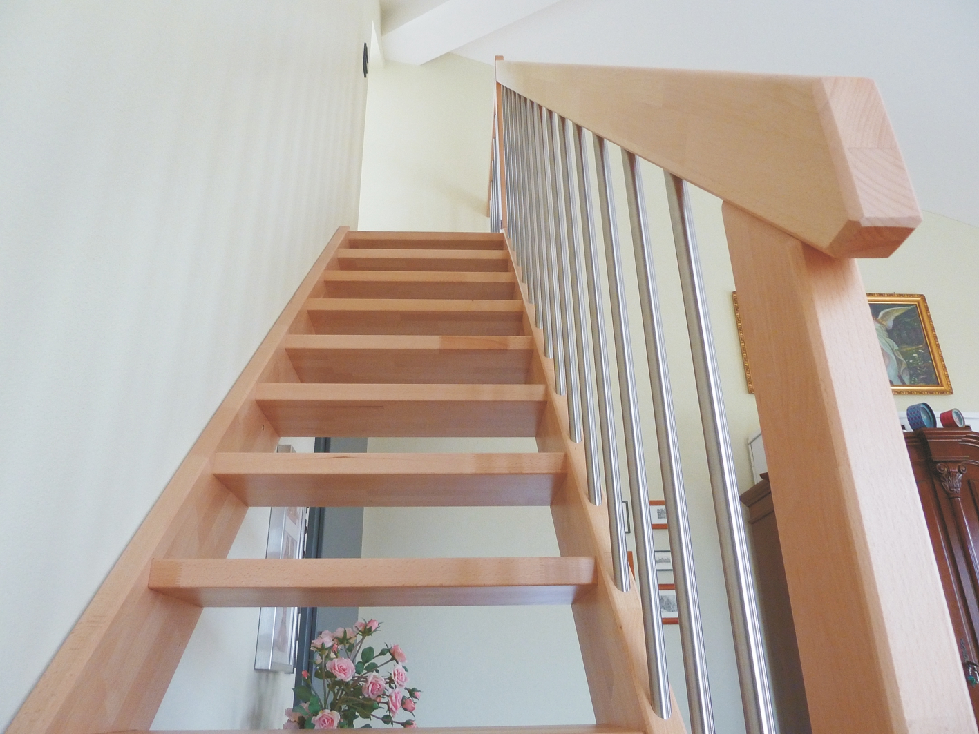 Wellhöfer Raumspartreppe topstep, Stufenform gerade, Holzart Buche lackiert, Geländer mit Edelstahlstäben. Traditioneller Treppenbau: Eingestemmte Stufen und wangenbündiges Geländer.