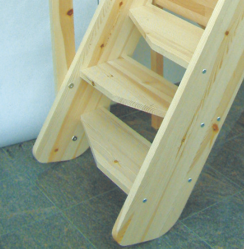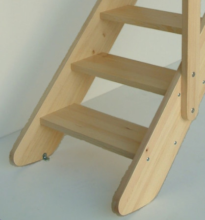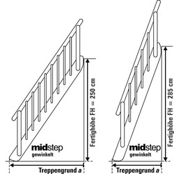 Im Vergleich zur Raumspartreppe topstep, die immer auf Maß gefertigt wird, haben die Treppenwangen der midstep immer die gleiche Länge. Die gewünschte Höhe wird durch entsprechende Neigung der Wangen festgelegt. Mit der midstep können Fertighöhen von 250 bis 285 cm abgedeckt werden und die Treppe steht je nach Fertighöhe etwas steiler oder flacher. Die Stufen werden nach Schablone festgeschraubt. Pfosten und Staketen werden aussen an Wange und Handlauf geschraubt.