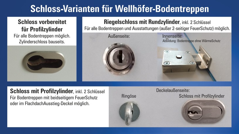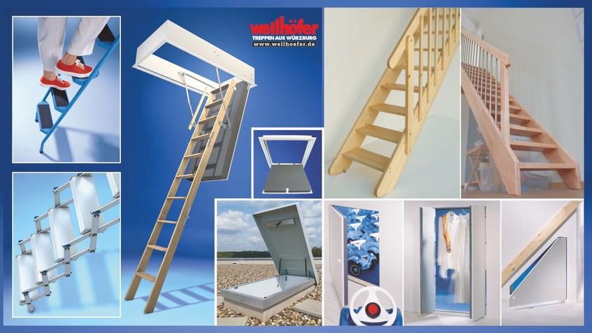 Wellhöfer Bodentreppen werden mit kompletten Montagematerial, Deckleisten, Einbauhinweis, Zugstab geliefert. Bei den Ausführungen mit WärmeSchutz oder FeuerSchutz ist jeweils das geprüfte Deckenanschluss-System im Lieferumfang enthalten.