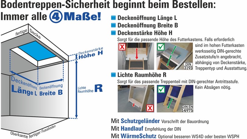 Geben Sie bei Bodentreppen immer alle 4 Maße an, neben Länge und Breite der Deckenöffnung auch Deckenstärke und lichte Raumhöhe. So erhalten Sie genau das Treppenteil, welches ohne Absägen passt und bei großen Deckenstärken eine DIN-gerechte Austrittsstufe, falls erforderlich. Die lichte Raumhöhe bestimmt die Mindestlänge der Deckenöffnung.