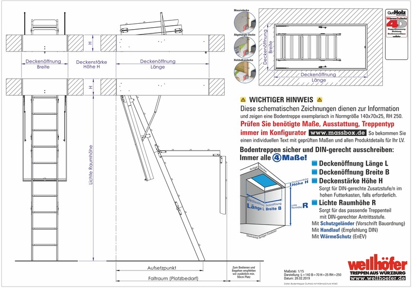 In den Zeichnungen sind die Bodentreppen/FlachdachAusstiege in den Mustermaßen Deckenöffnung 140 x 70 cm, Deckenstärke 25 cm (bei FlachdachAusstieg Konstruktionshöhe 45 cm) und lichte Raumhöhe 250 cm hinterlegt.