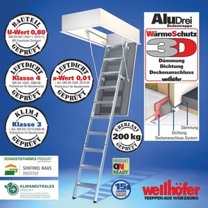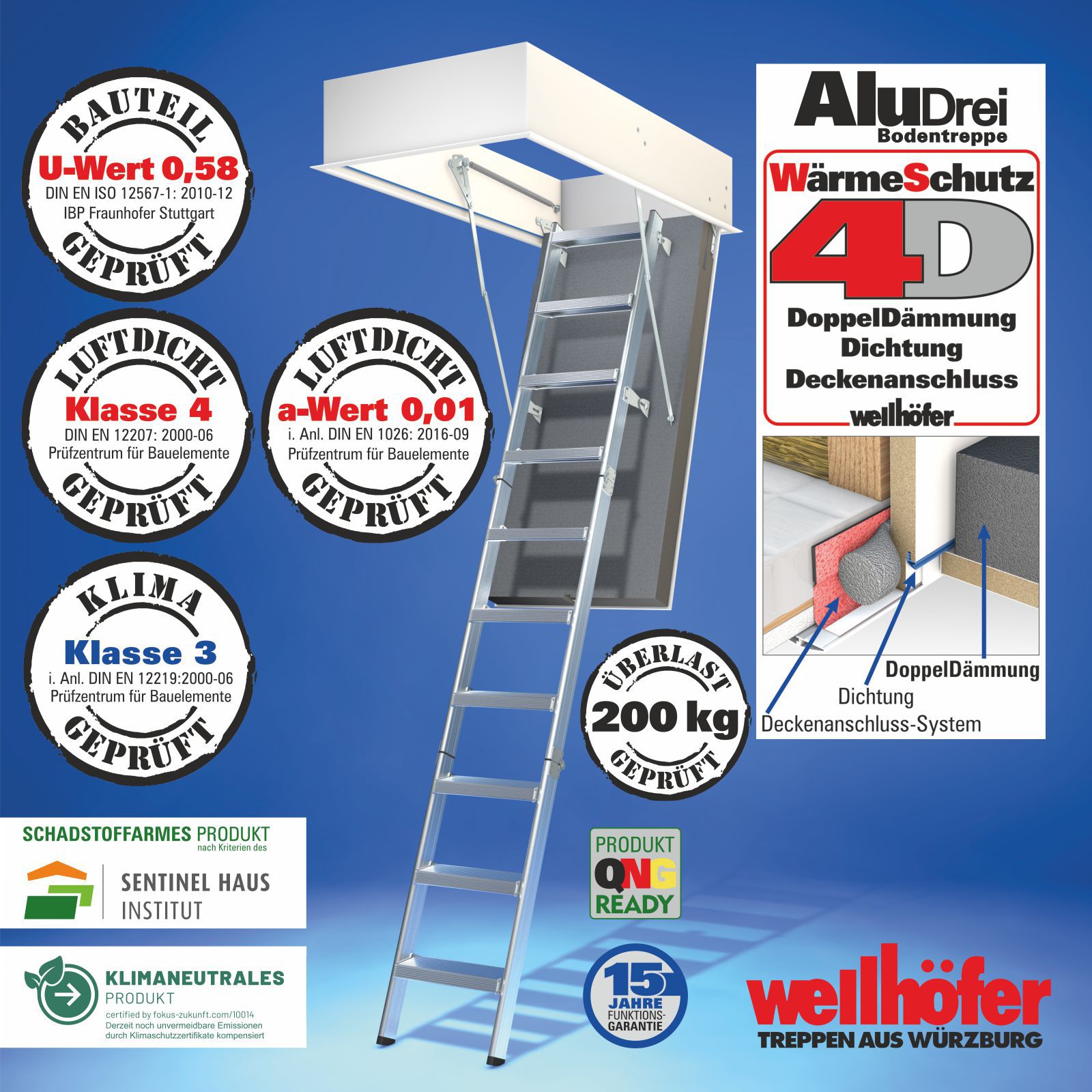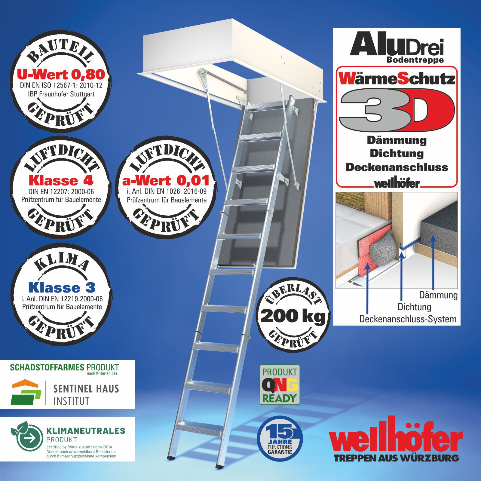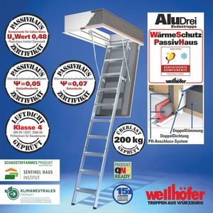 Bodentreppe AluDrei (dreiteilig, Aluminim) mit bestem WärmeSchutz WSPH (zertifizierte Passivhaus-Komponente):