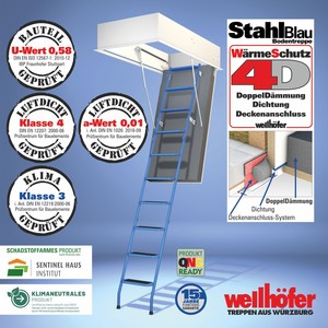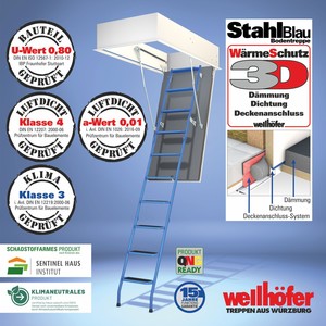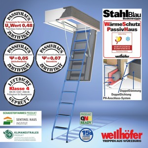 Bodentreppe StahlBlau (dreiteilig, Stahl) mit bestem WärmeSchutz WSPH (zertifizierte Passivhaus-Komponente):