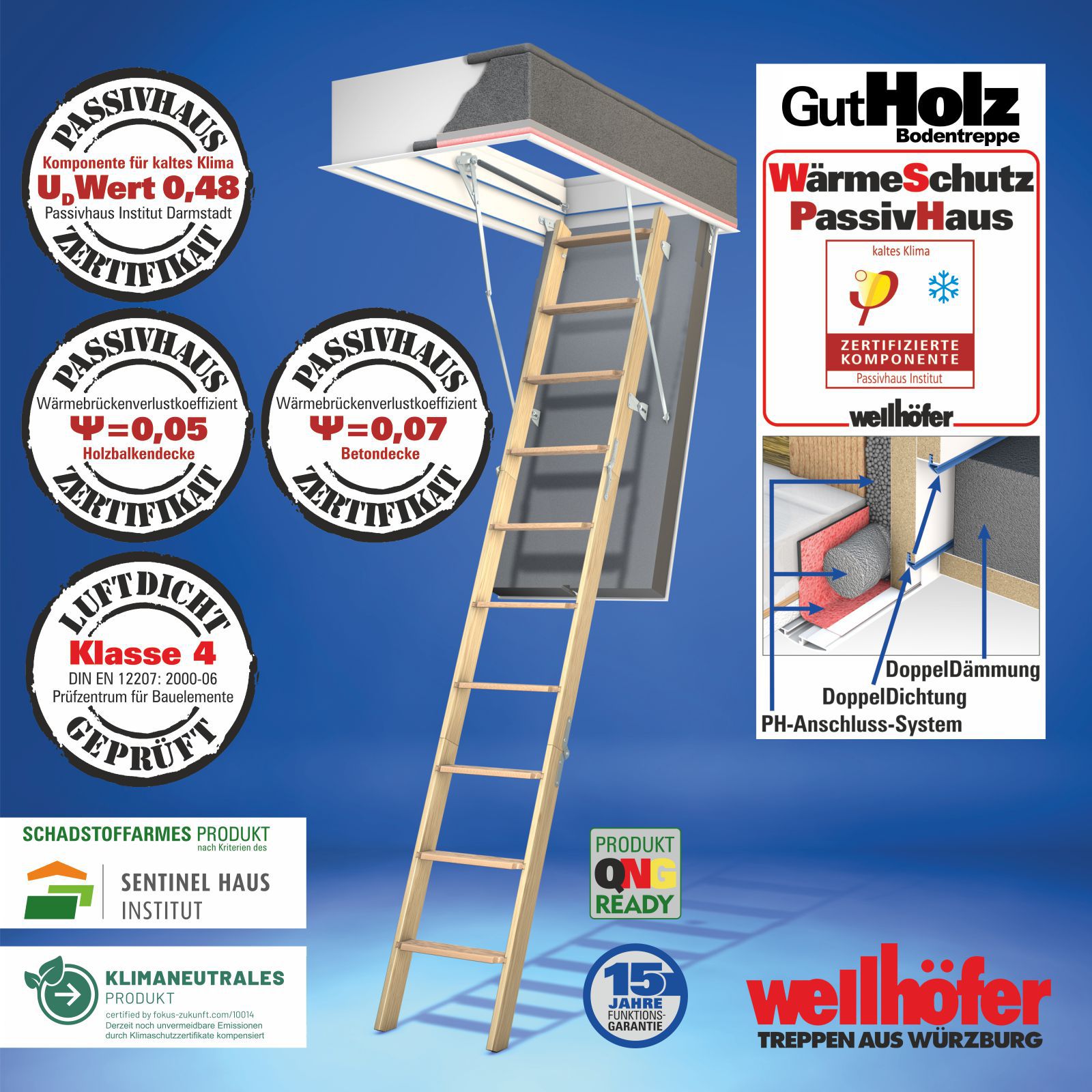 Bodentreppe GutHolz (dreiteilig, Holz) mit bestem WärmeSchutz WSPH (zertifizierte Passivhaus-Komponente):