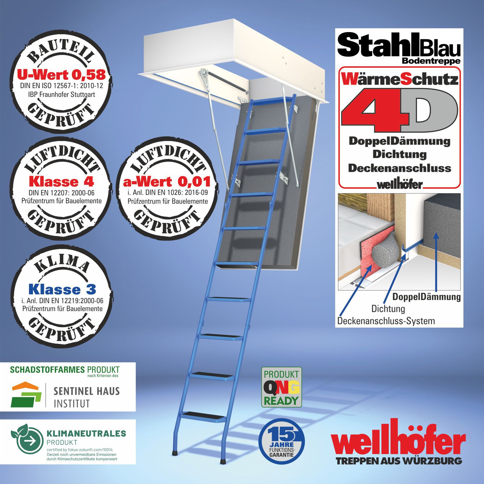 Bodentreppe StahlBlau (dreiteilig, Stahl) mit besserem WärmeSchutz WS4D:
