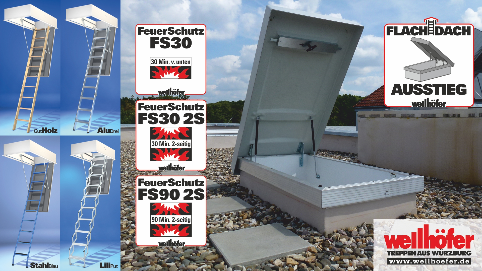 FlachdachAusstieg mit Bodentreppe GutHolz mit FeuerSchutz FS30 (Feuerwiderstand 30 Minuten von unten)